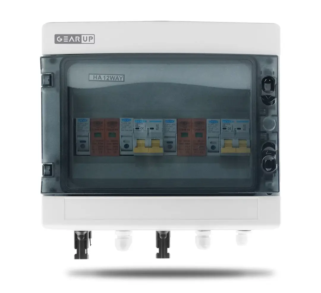 - Featuring high-quality Miniature Circuit Breakers (MCBs), fuses, and a Surge Protection Device (SPD), the GearUP 12-Way Combiner Box offers multiple layers of protection. It safeguards your system against overcurrent, short circuits, and harmful power surges, ensuring long-lasting stability and protecting your valuable solar investment from potential damage.