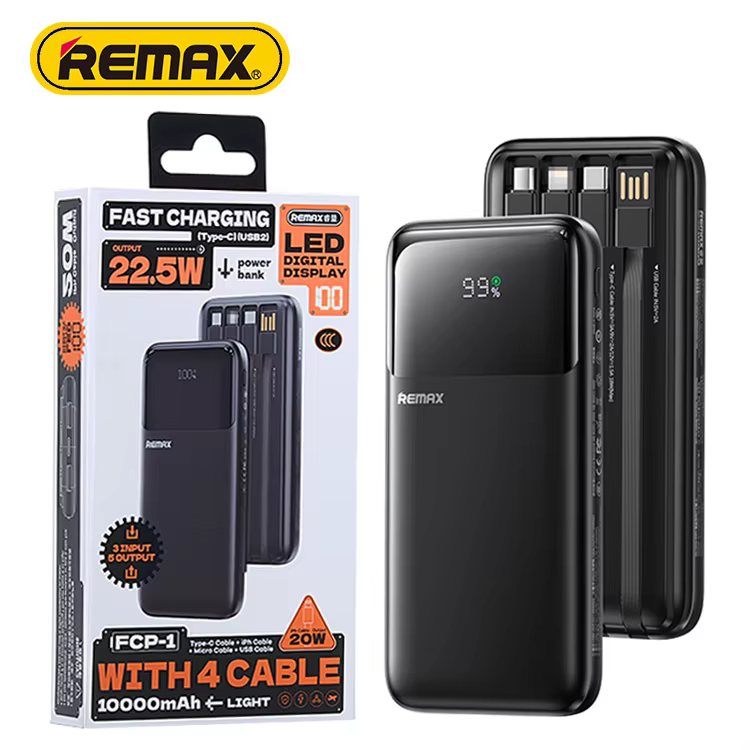 The REMAX FCP-2 is a powerful 20,000mAh quick charge power bank that features four built-in cables, providing convenience and versatility for charging multiple devices simultaneously. Its robust capacity ensures that users can rely on it for extended use, making it an ideal choice for those on the go. The integrated cables eliminate the need to carry extra accessories, streamlining the charging process and enhancing portability.