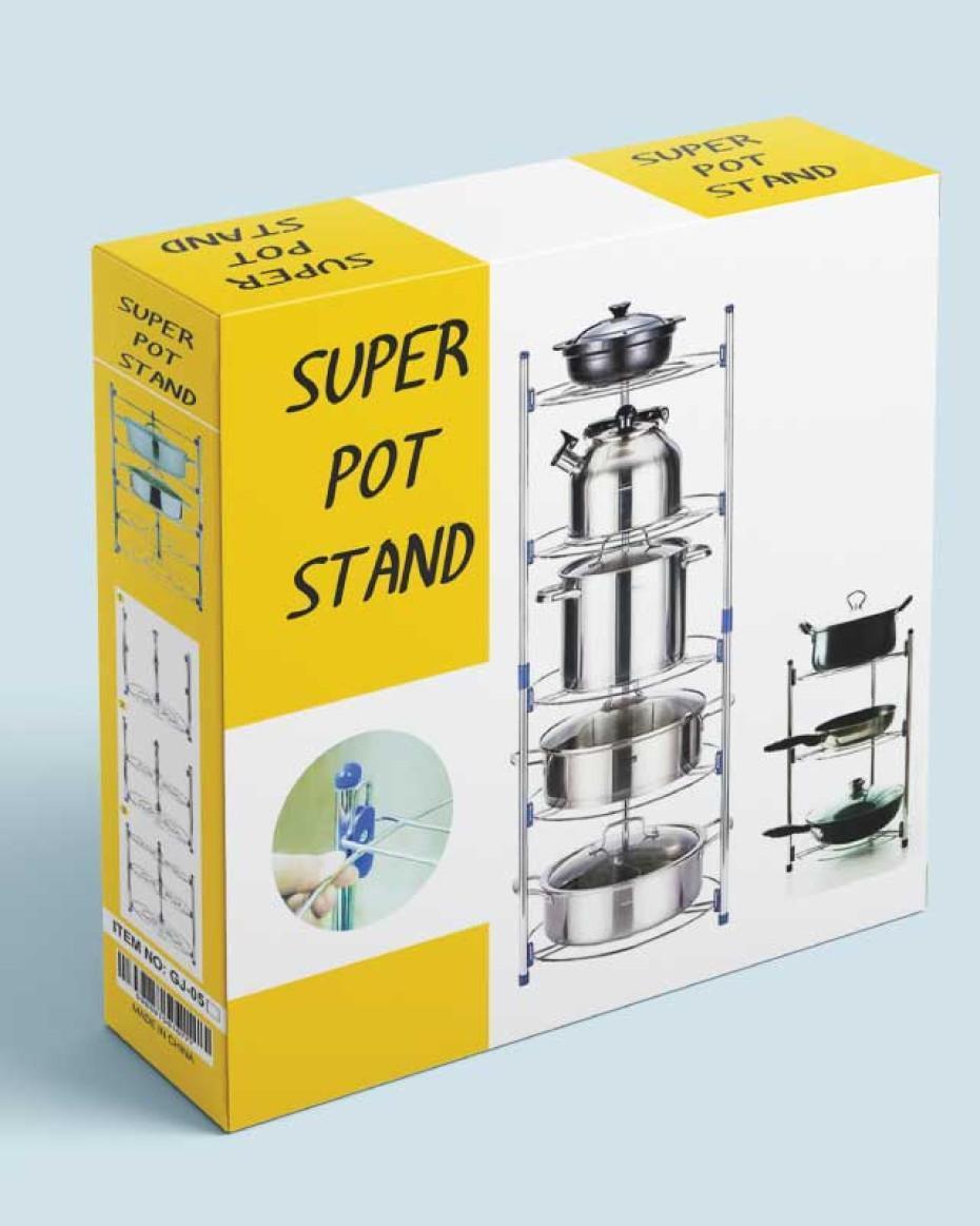 - Transform your kitchen into an organized haven with the Super Pot Stand 5 Layer Kitchen Pot Organizer. This multi-tiered organizer features five spacious layers to neatly store your pots, pans, and kitchen essentials. Say goodbye to cluttered countertops and cabinets, and enjoy a tidy, efficient kitchen. The vertical design optimizes your kitchen space, allowing easy access to your cookware while keeping everything in one place.