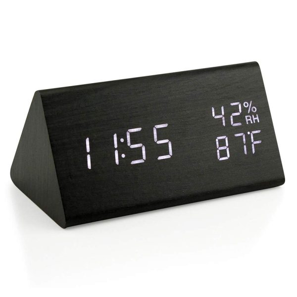 - The Triangle Wooden Style Digital LED Clock beautifully merges the charm of natural wood with the sleekness of modern technology, making it an ideal addition to any space. This minimalist clock showcases a distinctive triangular shape that brings a touch of sophistication to your bedside, desk, or living area. The subtle LED display conveniently shows the time, date, and temperature, seamlessly integrating into your decor. Whether your style leans towards rustic or contemporary, the wooden finish of this clock enhances your environment, transforming it from a mere timepiece into a striking statement piece.